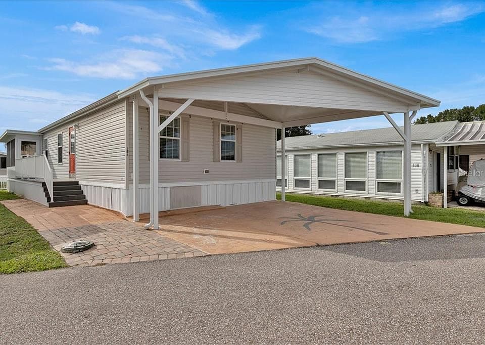 Beautiful home by the canal! This is Florida living at its finest! Perfect 2 bed, 2 bath in move-in ready condition. This well-maintained property is located in the coveted Outdoor Resorts Orlando gated community, which is zoned 55+. The property is located near Community Bathrooms #5 and #6. Entering through the enclosed sunroom, you will enjoy plenty of natural light with upgraded energy-efficient windows and plenty of space for entertaining. The house is fully furnished with quality furniture. The interior has laminate floors, carpet in the bedrooms, and vinyl in the bathrooms. The spacious kitchen is fully equipped with a stove, as well as a new side-by-side refrigerator with an ice maker, a full-size dishwasher, and a double stainless steel sink. Outside you will find ample covered parking for 2 vehicles and room for a golf cart! Enjoy the Florida weather on the back patio overlooking the canal. Outdoor Resorts is centrally located just minutes from Disney and restaurants, shopping, medical centers, offices, grocery stores, and major highways. A unique community offering great amenities including access to Lake Davenport with dock and boat launch, 2 pools, 8 bath houses, laundry facilities, shuffleboard, horseshoes, 9-hole chip 'n putt, FREE golf course, courts tennis/pickleball, and a clubhouse where owners gather to play cards, bingo, dinner, dancing, crafts, and morning coffee. HOA fee includes water, sewer, trash, basic cable, and grounds maintenance. Come and enjoy this fantastic lifestyle! Easy drive to all theme parks. Contact us to arrange a visit today!