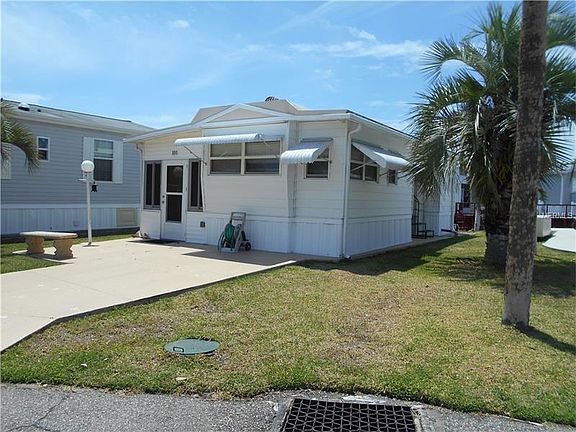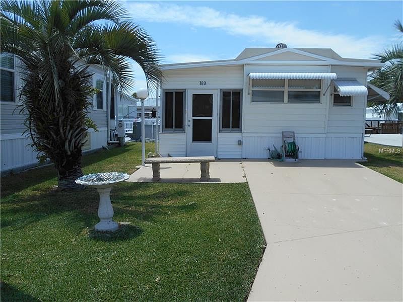 Cute as a button! This home is tucked to the rear of the lot to allow deep parking in the front while capitalizing on the rear of the home with a deck and seawall ON THE CANAL. Step in on ceramic tile floors and then laminate floors on the upper level. There is a corner stainless steel sink in the kitchen, a 2nd tv, a sleeper sofa and flat screen tv in the Florida Room, and a stackable washer and dryer. You step out from the laundry through the rear sliding doors to the relaxing deck. This home is conveniently located across from Bath House #4 and a short waling distance to the Clubhouse. Other features: Newer windows, palm trees, outside light, awnings, and a concrete bench. Put this on your list of "must see's". This is a great value for the money.