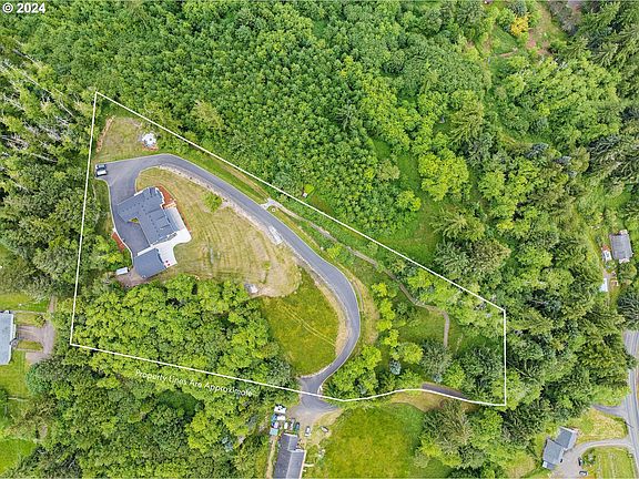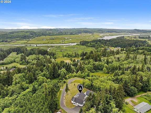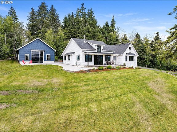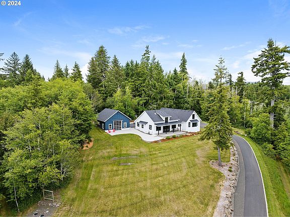 This gorgeous contemporary home is sited high on private acreage overlooking the Youngs River valley. High end finishes and custom fixtures abound from the moment you step inside. The home's interior features an open concept design that seamlessly connects the kitchen and great room. Accentuated by soaring vaulted ceilings, stone fireplace with wood stove insert, and sliding patio doors to a covered patio featuring expansive views of the river valley. Natural wood is celebrated in this home, from the Pella wood windows and doors, to white Oak floors throughout, to a handcrafted mantel and shelving made from trees that grew on site. The kitchen features quartz countertops, ss appliances including wine fridge, wet bar and pantry. Outside is a 30'x32' shop including a wood stove and 2 roll-up doors. An expansive concrete patio connects the house and shop, expanding the usable outdoor living space. Around the perimeter of the property is a private trail system with bridges and a fire pit, fruit trees, and extensive paving and hardscaping. Two tax lots are included. Quiet yet accessible country location, just 8 minutes East of downtown Astoria, 5 minutes to the fairgrounds, and 1.5 hours to Portland.