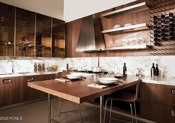 Stylish mountain estate home has a modern interior with sophisticated lines. The gourmet kitchen is appointed with bleached Canaletto walnut cabinetry displaying rich pinot glass fronts. Calcutta marble counter tops provide a spacious prep area for serious cooks. Professional grade appliances by Gaggenau, Smeg and Miele are representative of quality of this home. Vignette views provide a sense of discovery and connectivity as you enter and move through the home. The trim-less detailing around the doors, windows and smart home lighting system provide an uncluttered presentation. Custom white oak cabinetry and 7''wide-planked floors, along with Oregon interior Kerfed doors, exude a warm Scandinavian feel. While achieving a luxurious artesian look, the exterior finishes, designed with cutting edge green processes, are very low maintenance. Featuring Corten metal siding, a standing seam roof and hand-gathered stone exterior accents, the home has been commercially engineered with monolith