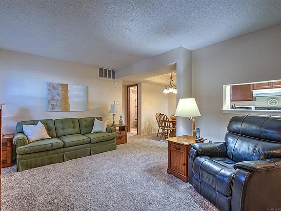 GREAT LOCATION! Only minutes from the River Parks Trail, ORU & Jenks Riverwalk. This ground floor condo has new paint and carpet as well as updated cabinets & counters in kitchen. Master bedroom has HUGE walk-in closet as well as access to private courtyard. Covered parking just a few steps away from private fenced courtyard. HOA provide a gorgeous pool, club house, trash, water, sewer & ext. maintenance.