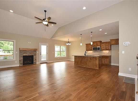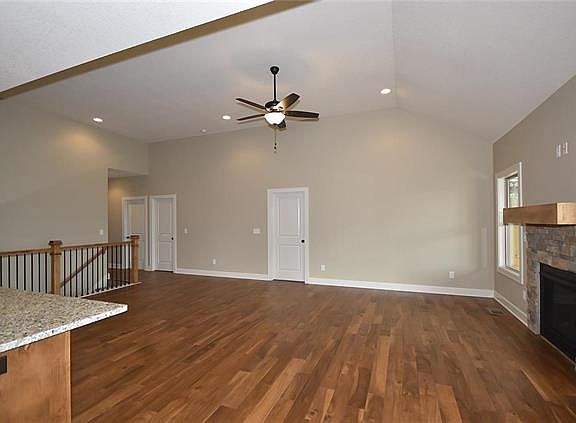 Open floor plan with a gas fireplace, wood floors and vaulted ceilings. The eat-in kitchen includes a large kitchen island, stained cabinets, a stove, microwave and dishwasher! Tile bathrooms, master bedroom with a walk-in closet and tile walk-in shower. Finished walkout basement! North Kansas City School district! Great location - nearby shopping, restaurants and highway access!