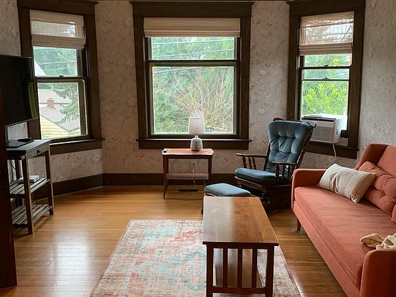 Fully Furnished. $3000/mo. 3-mo terms with the option of month-to-month after that. We would like to stay in the house for at least one month during each summer, but we are flexible about which month. The house was built in 1906 and has been lovingly maintained by our family for 50 years. There are three bedrooms, two of which have queen-sized beds set up. The guest bedroom has been used as an office and has a queen-sized guest bed available. If you would like us to set up a third bed, we can do that. One freshly-renovated bathroom with a new shower enclosure and vanity. Huge, connected living and dining rooms. Big fully-equipped kitchen with a new stove/oven. Mud room with working washer and dryer in the back of the house. Original hardwood floors, doorways, and molding in most of the house. Glorious bay windows in the living and dining rooms. We also have a quaint, SUPER rustic basement for you to hang out in . Bonus: I am a librarian and will stock it with books for you! :) We also have a huge outside lot, with apple and plum trees, as well as several raised beds that you can choose to garden in if you feel like it. There are lots of outdoor lounge-zones and old handmade Catholic shrines that are shaded and great for hammocks and rocking chairs in the summertime. The house is up two flights of stairs from the street, and there is a 15-foot rockery at the street level. This is great because it is in a convenient location--the house is perched about the Metro Route #20 bus stop and is about a mile from the Northgate light rail station--but still feels quiet and private, because it's above the traffic. Between June and December of 2022, we... -updated the electrical system -painted the outside of the house -built new staircases coming up from the street -stripped wallpaper and painted the kitchen and a bedroom -completely rebuilt the bathroom with a new shower, fan, vanity and tile floor -put in a new stove/oven -cleaned the roof -exterminated all rodents -re-routed rainspouts -had the furnace inspected -had the whole property inspected for safety -bought two new beds and mattresses -installed an air conditioner in the living room and brought in a portable A/C for the second bedroom The property will be managed by our friend Tracey, who built the bathroom and lives a mile away. (We live in Tacoma.) $150 pet deposit in addition to the other fees listed. Property is available for viewing on Sundays, Mondays, and Tuesdays, and then by appointment. $3000/mo. 3-mo terms with the option of month-to-month after that. Fully Furnished. Wifi and utilities included in the rent. Cleaning fee $125 Application fee $300 Pet fee $150/month You will be responsible for cleaning and bringing recycling, trash, and yard waste out to the street for pickup (on Thursdays). You can garden in the raised beds if you want.