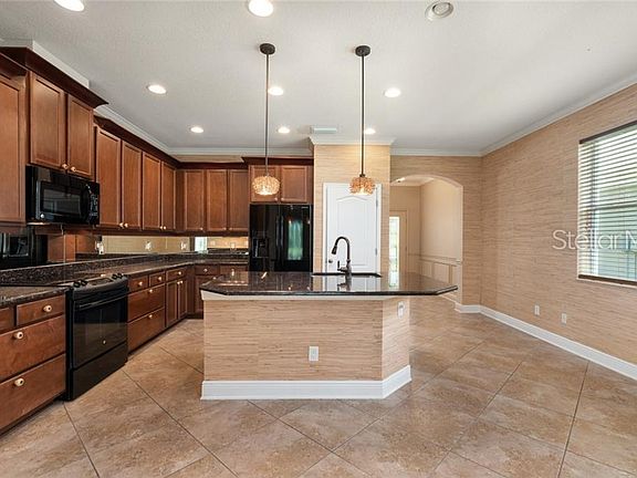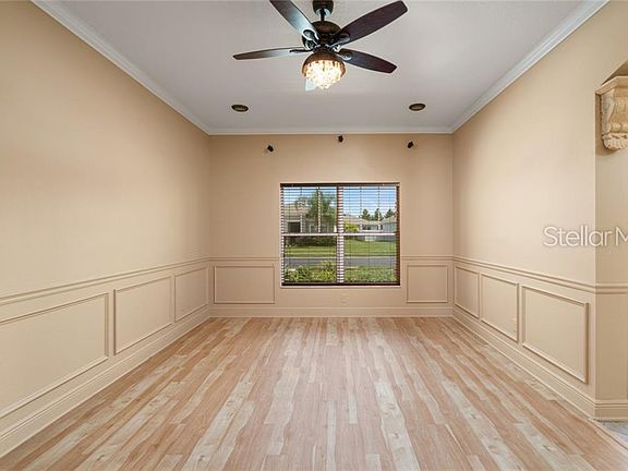 - Interior Features: Ceiling Fans(s), High Ceiling(s), Master Bedroom Downstairs, Split Bedroom, Crown Molding, Walk-In Closet(s), Window Treatments, Solid Surface Counters, Solid Wood Cabinets, Eating Space In Kitchen, Kitchen/Family Room Combo, In Wall Pest System