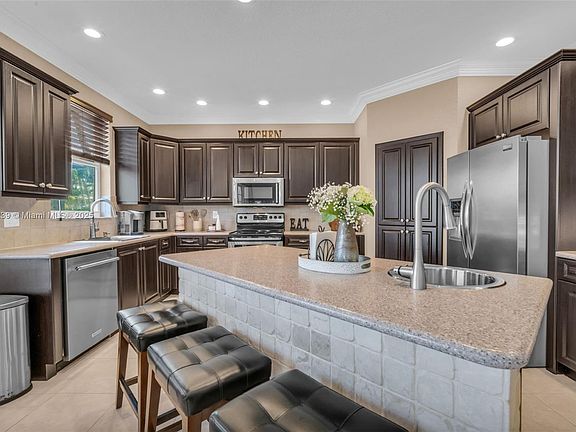 Step into your dream home—where luxury meets tranquility on a breathtaking lakefront setting. Two-story. Oversized lot. Premium upgrades throughout. Designed for luxury living. Gourmet kitchen, Corian countertops, tumbled marble backsplash, center island. Family room french doors open to covered patio with lake views. Spacious master suite with tray ceiling, double-door entry, and private sitting area. Upstairs office with lake view balcony. All bedrooms upstairs. Resurfaced pool-2022. Outdoor kitchen. Power awning and outdoor sound system. Landscaping with lighting. Electronic blinds over French doors. Outdoor gazebo with sofa and fire pit. New roof-2021. 5-ton A/C-2021. Tank-less water heater-2021. Water softener system. A piece of paradise with amazing sunsets. Move-in-ready