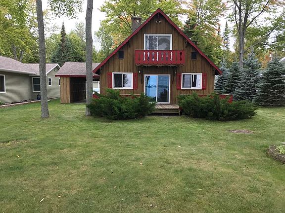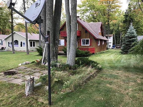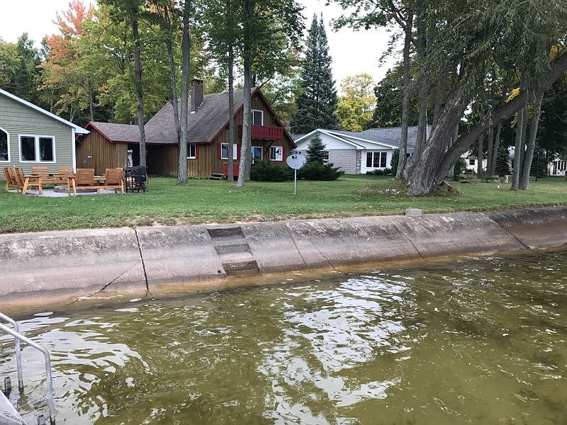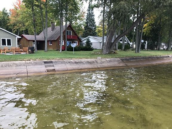 60 Feet Of Lake Frontage! 1480 sqft Chalet home , 1 1/2 stories, 3 bedroom , 2 baths. attached lean too with storage underneath. 2nd lot, with 4 car pole barn. Other home features , open floor plan, brick wood burning fireplace. Upper floor walkout deck. Has 2 story shed, 10 x 12. Seawall. Structurally sound, needs up dating.