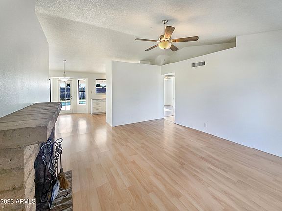 Come see this charming 3 bedroom, 2 bathroom Peoria home now back on the market after a brief term off market in January 2023 to renovate, including: new exterior paint, new SS appliances, new stone counters in the kitchen, and updated bathrooms! Flow into the living room featuring a cozy fireplace, perfect for entertaining. Enjoy preparing meals in this impressive kitchen equipped with ample cabinets and generous counter space. Step inside this beautiful interior with vaulted ceilings, tile floors throughout, plenty of natural light, and neutral palette. The main bedroom boasts a private ensuite with dual sinks and walk-in closet. Other bedrooms offer plush carpet and sizable closets. Step outside to your sparkling pool in the fenced in backyard, host the next gathering here! Don't wait!