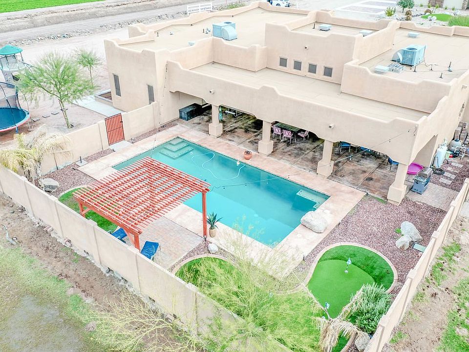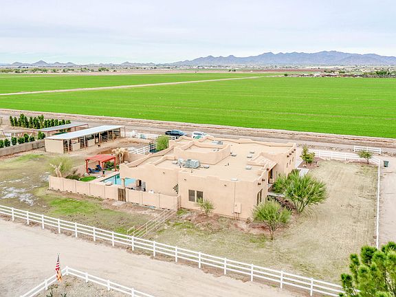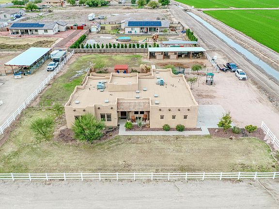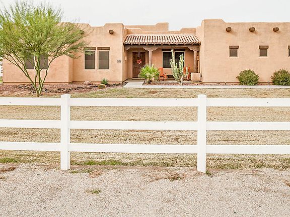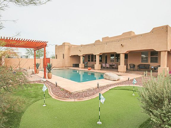 REDUCED TO SELL. Luxury custom on 1+ acre horse property with flood irrigation. Split floor plan 5 bedrooms includes 2 master bedrooms, 3 full baths, oversized 3 car garage with 8ft door height. Four covered Horse Stalls with lights, water, pasture turn out. Entertainer's backyard has a sparkling pool, full length back patio, updated pergola patio cover, sythetic grass and putting green. Great room boasts 14 ft ceilings with a Southwest flair, fireplace, media niche, s.sound. Gourmet kitchen has custom cabinets, granite tops, breakfast bar, salad bar/sink and pantry. Master suite has a separate exit. Master bath has a walk in snail shower, jet tub, bronze harware. Flooring 18 inch tile in main areas. RV parking and space for your toys. Mountain views.