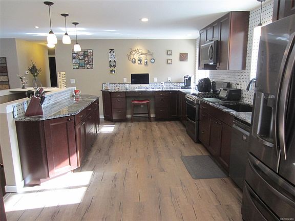 You won't be disappointed with this home. Completely remodeled 3 bed/2 bath ranch home. Backs to greenbelt, trail and close to park. Kitchen is beautiful with cherry cabinets, granite counter tops and custom tile work. Open floor plan with family room, kitchen and dining room all open to each other. Dining room has a cozy fireplace. Master bedroom has his and her closets and opens to bath. Two additional bedrooms round out the main floor. Basement is perfect for entertaining, family time or quiet enjoyment. Beautiful granite wet bar with stools, pool table and room for watching movies/TV or just enjoying the fireplace. Plenty of room for a desk/office area. Wonderful large laundry room with etched barn door, lots of storage, utility sink and washer and dryer included. Basement bathroom has also been remodeled. Beautiful xeriscaped backyard with large patio, artificial turf, dog run, new fence and large shed. RV parking for two vehicles, 30 amp hookup plus two add'l off-street spaces.