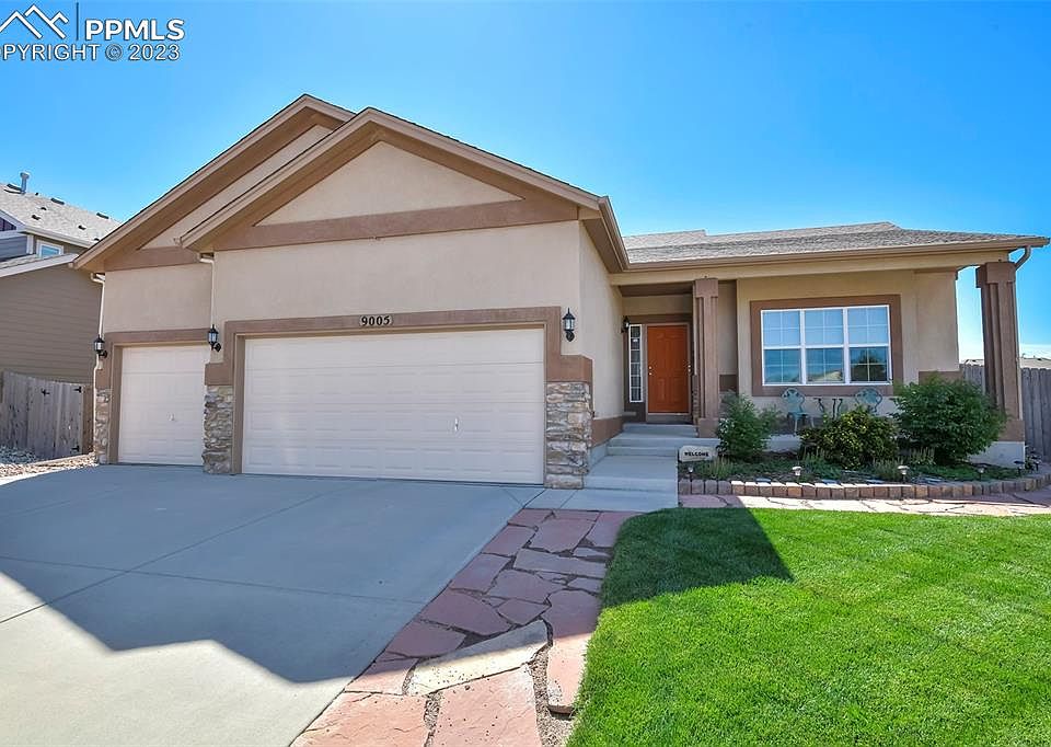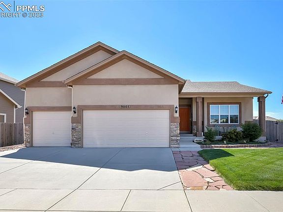 Fantastic 5/3/3 Single-owner Stucco and Stone Rancher with THREE main level bedrooms and Peak views! Gorgeous landscaping with flagstone pathways and inviting covered front porch entry opens to walkout vaulted Great Room with hardwood flooring, gas fireplace and Peak views to the side! Open floor plan to the kitchen with long counter bar, pantry, brushed stainless appliances including flat top range, loads of cabinetry and a long soffit to display knick-knacks and art work! Offset separate Dining Room with wonderful picture window to welcome the day in! Main level master off entry has tray ceiling and attached walk-in closet and 5 piece bath with walk-in shower and enormous soaking tub with Peak and Mountain Views! Two more ample sized main level bedrooms (one currently used as an office) and full bath. Lower level boasts expansive L-shaped Family Room complete with gas fireplace, pool table, and wet bar with built-ins and mini fridge. Two more ample sized bedrooms (one is currently a home gym) as well as third full bath, and large storage room (separate from utility room!) Main level laundry with washer and dryer off of 3-car garage. Private fenced backyard has mountain and Peak views from large concrete patio with Gazebo. Beautifully landscaped with a mix of lawn and xeriscaping...including extended side yard with gravel! Located just northeast of Woodmen and Black Forest Road, the cozy neighborhood allows access to nearby Powers, Grand Peak Academy Charter School, Legacy Peak Elementary, St. Francis Hospital, Pride Soccer Complex, shopping, restaurants and so much more!