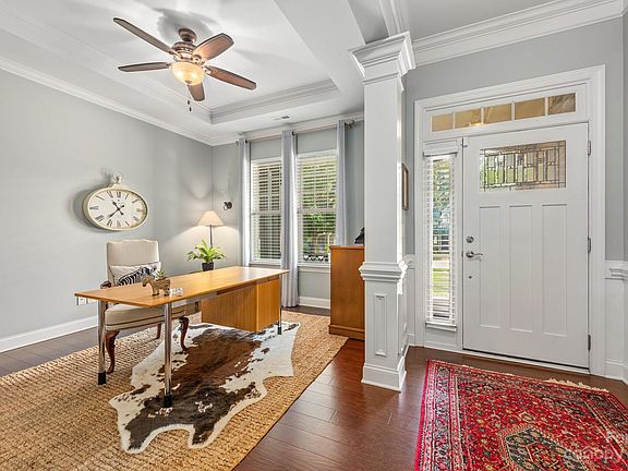 Impeccably maintained, low maintenance, one-story living in desirable Barber Rock. This 3 bedroom, 2 bath full brick and stone home with study has been gently lived in by seasonal owners. The spacious primary bedroom features a large bay window, walk-in closet and a luxurious en-suite with double vanity, soaking tub, and separate shower. Two secondary bedrooms are generously sized and share a full bathroom. The kitchen boasts granite countertops, stainless steel appliances, and a large island overlooking the great room with stone fireplace. A light-filled breakfast room is perfect for enjoying your morning coffee or step out onto the covered patio and take advantage of the manicured, irrigated lawn. The formal dining room is perfect for entertaining, and the extensive moldings, wainscoting, upgraded lighting and 10 foot ceilings throughout are sure to impress. Barber Rock residents enjoy serene surroundings convenient to Ballantyne as well as a neighborhood pool and playground.