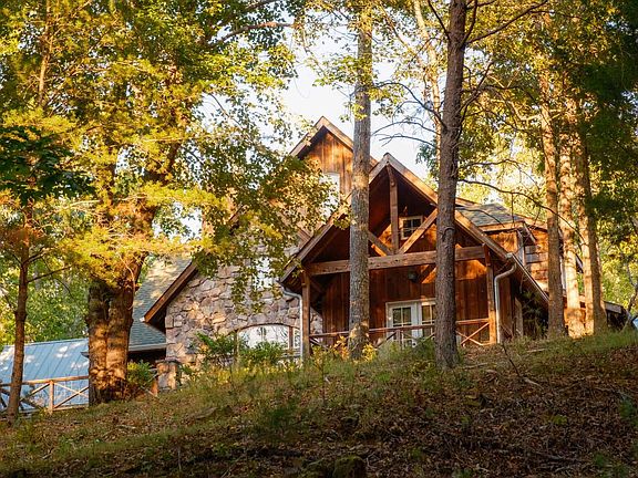 At the heart of the property is a charming 2,938± square foot cabin with a wood and stone exterior, distinctive rambling roofline, curved windows, meandering rock walkways, and multiple porches. Built into the hillside, the house has three levels, a walk-out basement, and views of the lake. Inside, you'll find cathedral ceilings, a stone fireplace, and exposed beams in the welcoming living room and beautiful wood trim and accents throughout the entire five-bedroom and four-and-a-half bath cabin.