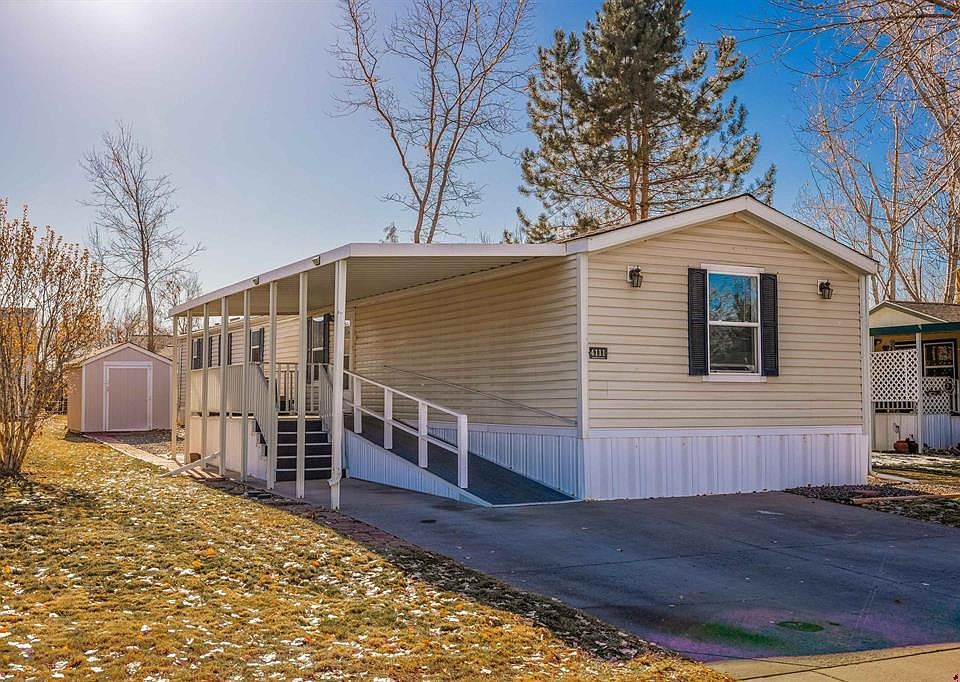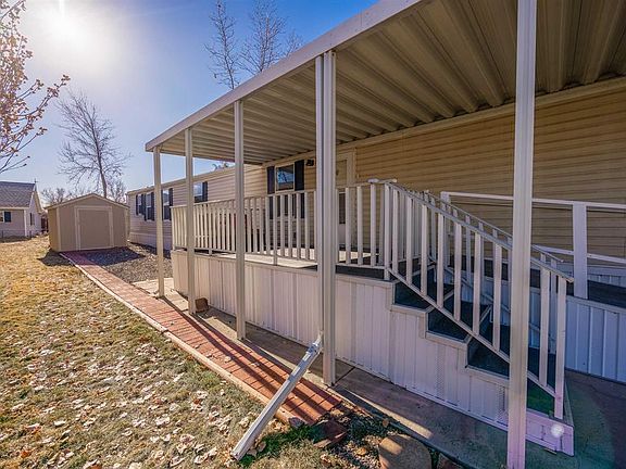 This beautifully remodeled 3-bedroom, 2-bathroom home in the desirable Cimarron Creek Community offers modern comfort and style. The ramp leading to the welcoming porch is ADA compliant. Step inside to the bright and airy atmosphere where this home is the perfect place to settle in. This home features laminate flooring, updated windows, newer water heater and furnace. Enjoy cozy evenings by the fireplace in the spacious living area, and take advantage of the natural light that fills the home. The modern kitchen comes fully equipped with a refrigerator, range/oven, and microwave. Window coverings are included as well as the washer and dryer. The primary suite is spacious and offers a large walk-in closet. Furnishings shown are available. For additional storage there is an 8' x 8' shed ideal for housing lawn equipment or extra belongings. The home also has leaf filter gutters with a lifetime transferable warranty. The homeowner is responsible for maintaining the yard, including mowing the lawn, keeping the leaves tidy, and caring for the exterior of the home. The monthly space rent is $676. While the land is owned by the mobile home park (this is a chattel-only sale), you'll enjoy the perks of living in this well-maintained community. Don't miss out on this opportunity to own an updated home in a sought-after location!