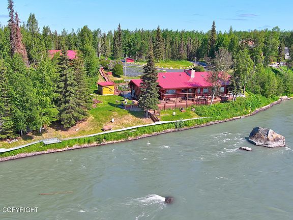 Beautiful Estate on the Kenai River, 3025sf Custom Log Home,10 to 16'' logs from Canada-Highland Log Builders. 353.91ft of River Frontage with great fishing from fishing platform.Open floor plan,Vaulted ceiling, Slate floor,Rock fireplace,Fire suppression system,Artesian Well,Custom Deck Covers.Caretaker apt. 416sf,1039sf garage.Woodstove fired sauna,,Immaculate Landscaping.Decks,Paved driveway.Reverse osmosis.Sheds,Tennis Court now used as helicopter pad and/additional entertainment area for large events.Dry Cabin w/bunkbeds and woodstove.Smoke house. Totem Pole with special story. Apt attached to garage 1bd 1 bathrm,full kitchen and living area. Total new roof on house, new metal roof all all other buildings. Garden/Flower/grass watering systems.