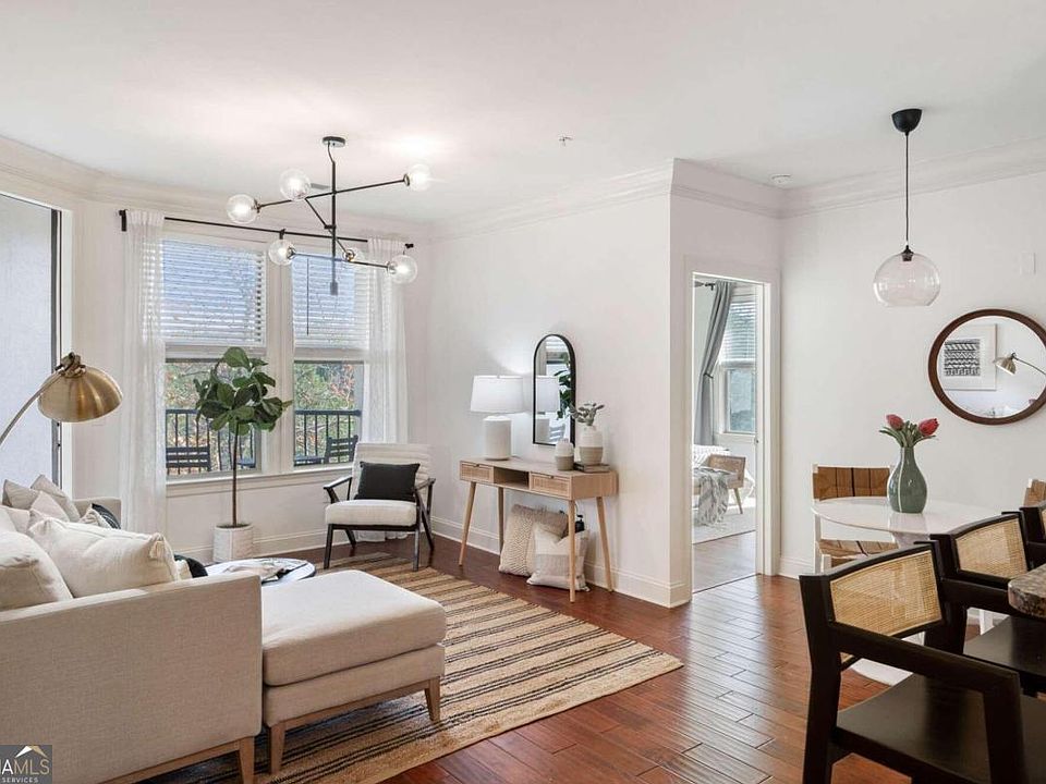 Welcome home to this rare end unit condo in sought after Sandy Springs! Located in the lovely, gated Serrano community yet only minutes to all the city has to offer, this attractive unit is move-in ready and comes with 2 coveted, reserved parking spaces and very valuable storage unit! Bursting with natural light, this condo is the complete package boasting engineered hardwood floors throughout, including the bedrooms, and neutral paint ready for your own personal touch. Enjoy the open concept floor plan offering flawless flow and functionality perfect for everyday living and entertaining, and delight in the modern kitchen equipped with timeless white cabinets, granite counters, stainless steel appliances and breakfast bar. Dining area furnishes dinette cabinets for extra storage. A private balcony overlooks lush landscaping and is the ideal spot to sip a warm morning coffee or relax with a crisp evening beverage. Retreat to the spacious primary bedroom accompanied by a sizable en-suite featuring a double vanity with granite counters, large shower, soaking tub and a walk-in closet with built-in shelving. Secondary bedroom is adjoined by a massive closet currently functioning as a useful office space. Upscale amenities include concierge, theatre, clubroom, pool/sauna and fitness room. Located in a premier location convenient to shopping, dining, multiple parks, Perimeter Mall, High Street Atlanta, Ashford Lane, GA 400, MARTA and Mercedes-Benz Headquarters!