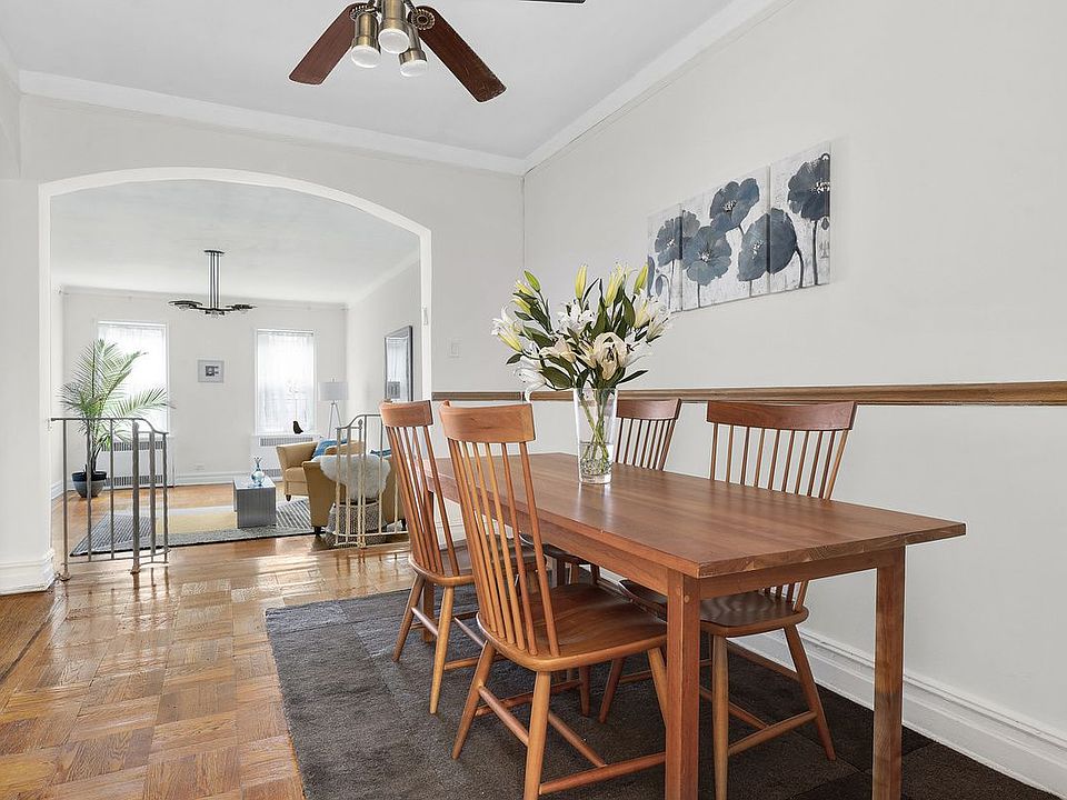 This quiet corner two-bedroom apartment has large pre-war proportions, elegant arches and beautiful herringbone oak parquet floors. With the perfect layout, the apartment opens onto a spacious foyer with a large walk-in closet and flows into a large dining area overlooking the elegant sunken living room. The kitchen with lots of cabinetry and counter space features a built-in sitting area next corner windows and includes two sinks and a dishwasher. The grand master bedroom with two exposures has a double closet and plenty of space for a king-size bedroom set. Across the hallway, the second bedroom is spacious and private. The bathroom has a window and next to it is a closet, formerly a shower stall, so some owners have converted it into a powder room. 901 Avenue H is a well maintained pre-war elevator building with a laundry room and live-in Superintendent. This apartment comes with a storage unit for an additional monthly fee. It is located on the cusp of Ditmas Park and West Midwood on a tree-lined street with the Q train at Avenue H in one direction and the "F" train at 18th Avenue in the other. While in the neighborhood, check out Milk and Honey or The Ox Tavern for some tasty delights or a quick coffee.