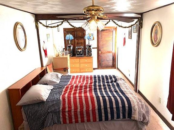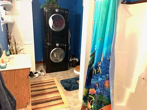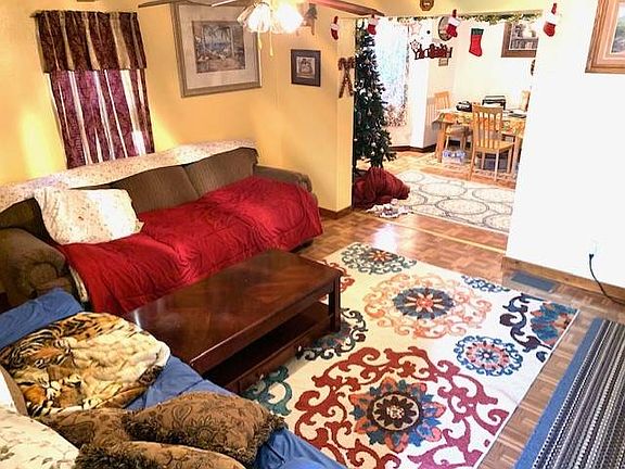 Entrance: Front and back porches both have cement floors and glass enclosures. Kitchen: Lots of oak cabinets, vinyl floor and stainless steel appliances, glass top stove and side by side refrigerator. Dining Room: Spacious! Walk in bay window area (thermopane) parquet design vinyl floor, painted walls. Living Room: Open to dining room continuous decor as dining room with parquet design, painted walls. Bedroom: This large room was once 2 bedrooms and could easily have the wall put back in for more bedrooms, cream plush carpet, painted walls. Bath: Very large, white fixtures, tub shower combo, vanity, plus area for your washer/dryer. Upstairs: One large room has painted drywall, new luan underfloor for future floor covering. Great room for kids or hobbies, presently used as a weight room. Mechanicals: 100 amp with breakers, gas forced furnace, central air conditioning, all thermopane windows, vinyl siding. Garage: Detached oversize garage presently used as storage, brick patio area between garage and house.