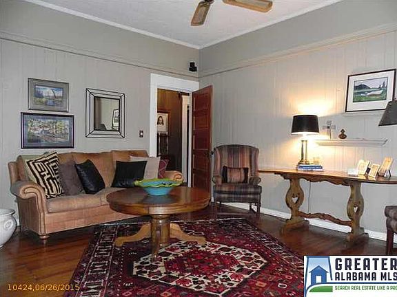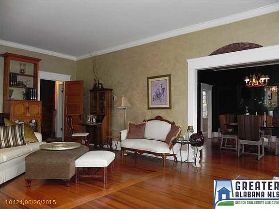 Charming 4 bedrooms 2 and a half bath home with unique vintage features that include Decorative stain glass windows, Skelton key door knobs, Transom windows above doors, French doors, Hardwood, tile, and more. Eat-in Kitchen features a Dutch door, cement counter tops, tile backsplash, island, luxury oversized refrigerator and double oven. Dining room has antique ceiling tiles. Breakfast room with Bay window, could also be used as an office. Living room includes a fireplace and hardwood floors. Den with tile floors and window shutters. Enter Sunroom through French door. Master bedroom with Master bath that has tile shower with glass wall, garden tub, and double vanities. Huge back deck has privacy, arbor, and planter benches. Corner lot. Anniston Country Club is conveniently right across the street!
