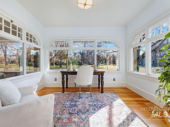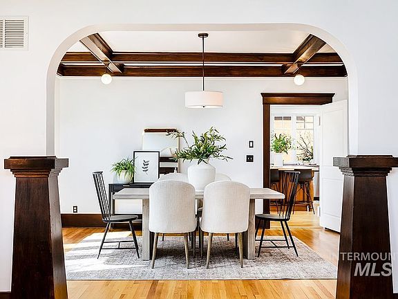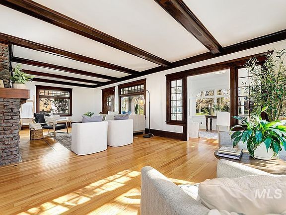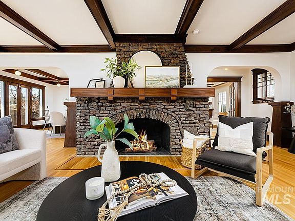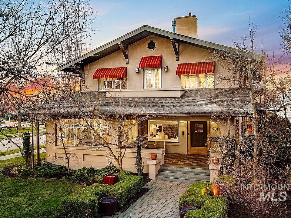 A hallmark of North End architecture, this distinguished 1915 Arts & Crafts Bungalow is beautifully set at the gateway of Harrison Boulevard. The Boulevard is lined with premier residences displaying exceptional craftsmanship, accentuated by commanding old-growth trees. Listed on the Register of Historic Places, this exquisitely built and restored residence exudes curb appeal with a nostalgic deep-set front porch, broad overhanging eaves, stucco-clad exterior, and quaint window awnings. The entry opens to characteristic hardwood floors, wood windows, and impeccable quartersawn millwork that has been preserved with great care. The home reveals over 4000sf of lovely living quarters interconnected by graceful curved entry ways and glass doors. The kitchen, bathrooms, and major utility upgrades compliment the original architecture and provide modern conveniences. The incredible original brick fireplace of grand scale has been impeccably preserved and anchors the living room.