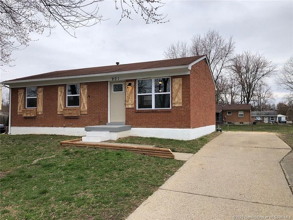 100% financing available for qualified buyers! Ask for details! Come take a look at this beautifully remodeled brick ranch with 3 bedrooms and 2 full baths! Finished basement with a family room and 2 potential bedrooms(no egress windows)! Lots of custom features! As soon as you step in the front door, you'll fall in love with the open floor plan and the all new kitchen with white cabinets, finished butcher block countertops, ceramic backsplash, and custom built breakfast bar! Both full bathrooms feature custom ceramic tile and are all new including the vanities! Refinished hardwood floors! New lighting throughout including LED lighting! New HVAC! New water heater! New windows! This home shows like new construction! All of this and the home sits on a large corner lot! Easy access to all of Southern Indiana and the Lewis and Clark Bridge! Call today before this home is sold!