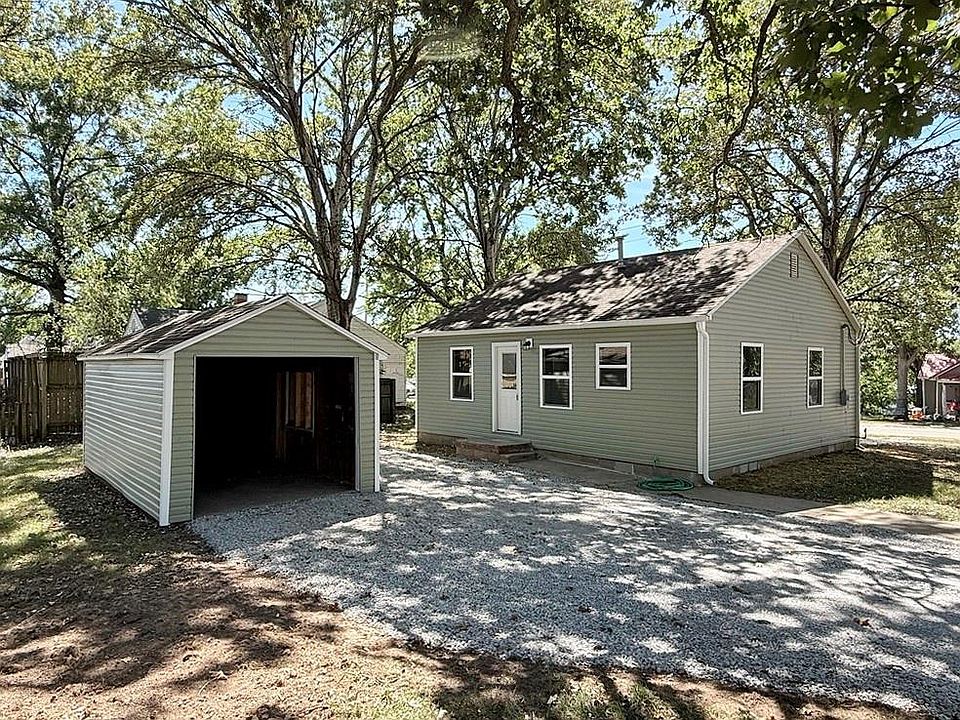 Affordability without compromise has just hit the market in El Dorado Springs, MO. This 2-bed, 1-bath bungalow in the heart of town has been completely updated inside and out, making it both move-in ready and priced to sell. The efficient 728 sq ft layout of this home in Cedar County, MO is simple yet functional. Updates include new siding, gutters, windows, flooring, paint, trim, interior doors, fixtures, a fully renovated bathroom, new kitchen cabinets, all-new electrical, all-new PEX plumbing, a new water heater, new insulation, and a new gravel driveway. This place is truly turn-key and 100% move-in ready. The home sits on a full, unfinished basement- perfect for storage, shelter, or additional living space- with a newly built walk-up entrance that adds versatility. A 1-car detached garage offers covered parking and storage. Low-maintenance homes at this price point are hard to find…don’t miss this one!