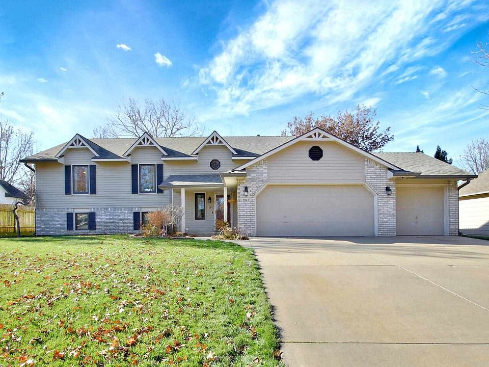 Absolutely perfect family home in the coveted Oakwood Valley Estates neighborhood of Derby! Get ready to be wowed by the spacious interior and fantastic exterior living spaces of this move-in ready home! The main floor of this property is filled with natural light. This semi-open floor plan offers both a formal dining area and eat-in bar in the kitchen. New kitchen appliances all stay with the home! The oversized main floor master bedroom also has nice large windows and your own master ensuite bathroom with separate tub/shower and large walk in closet! Large family room/rec room in lower level is made cozy with the wood burning fireplace. Three large bedrooms, a full bath and storage galore fill every inch of space in this well thought plan. Walk out your sliding doors to the fantastic backyard! A fun fire pit, concrete patio and deck offer several options for family and friends to gather. A large shed provides all the room you need to store yard equipment - leaving tons of space in the three car garage to actually park cars! Numerous upgrades to this home! New exterior paint (Dec. 2020), Ceilings redone (Dec. 2020) New roof and gutters (2017), Partial new windows (2019) New interior paint (August 2020), Front yard sprinkler system (March 2020) New 8 X 12 storage shed (2019). Don't miss your chance to own this great property!
