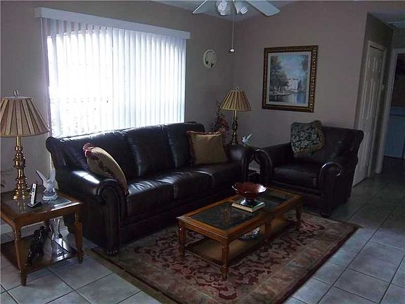 Clean, Bright and All Right! Charming 3/2/2 Block home on Corner lot is move-in ready! List of Newer items available. Sunporch shades allow comfortable outdoor living. Interior all decorated for you. Granite Countertops, Snack Bar, Reverse Osmosis water at Kitchen Sink, Living room & large entertainment room. Laundry room w/set Tub. Picture yourself here; just bring suitcases!