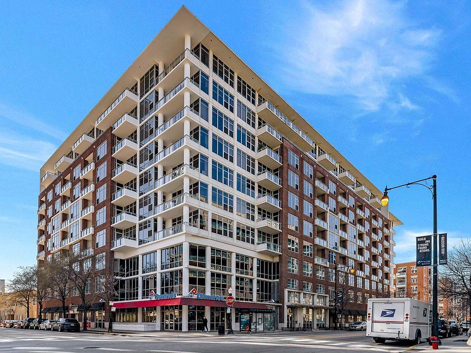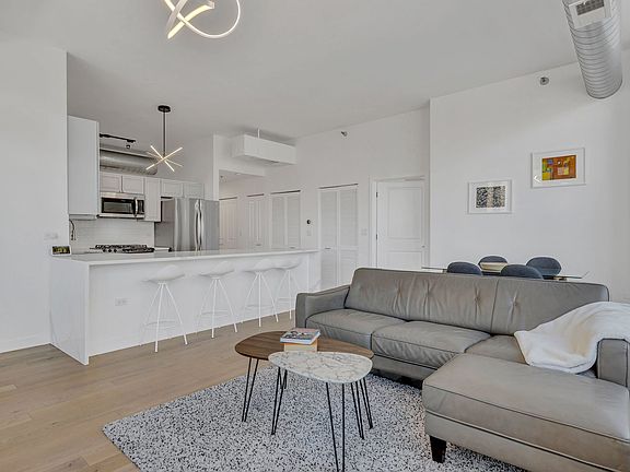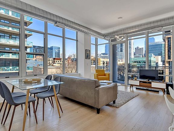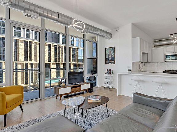 This beautiful, corner-unit home has been completely renovated from top to bottom with no expense spared. Chic lighting along with gorgeous new wide plank oak hardwood flooring is found throughout the entire space. The open kitchen adorns tall cabinetry, stainless steel appliances and a massive island with a beautiful quartz waterfall counter that seats 4-6. The spacious living room offers plenty of space for a full dining room, and opens onto your massive private balcony. The primary suite has ample closets and a gorgeous en-suite bathroom. The sprawling layout is perfect with a split floor plan, a second bedroom with stunning city views, and a separate den or office space conveniently tucked away. The 2 full baths have both been completely remodeled with walk-in showers, elegant stone finishes and satin nickel fixtures. Full amenity elevator building features door staff, a spacious sun deck with chairs and grills right on the 4th floor, plus an exercise room and community room with another terrace on the penthouse level. Deeded, heated, extra-wide garage spot available for $30,000. Located in the robust West Loop with countless restaurants, bars, groceries, easy access to public transportation and the highways. Welcome home!