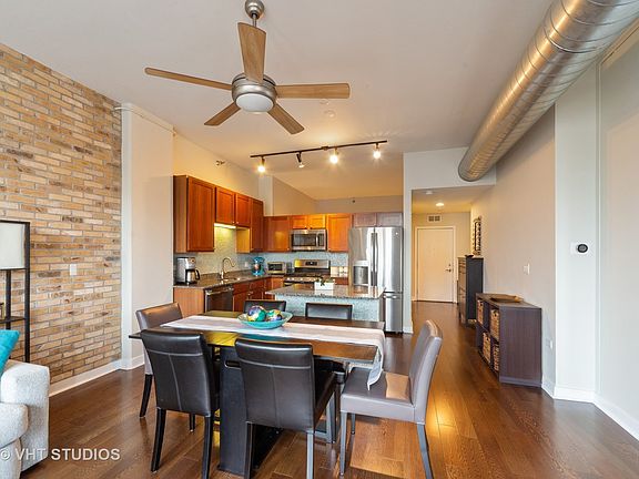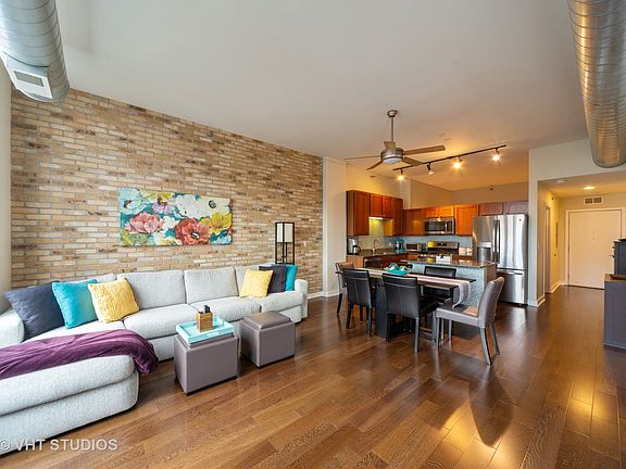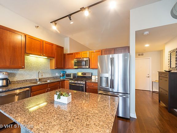 Sundrenched 2 bed/2 bath condo in prime West Loop location! Great open layout with split floor plan. Kitchen offers SS appliances, custom backsplash, granite countertops and breakfast bar. Large living space with room for dining room leads to west facing spacious balcony. Master suite offers large bath w/double vanity and custom built walk-in closet. Heated garage parking and additional storage INCLUDED in price. Additionally, condo features in-unit laundry, hardwood floors and large windows with custom window treatments. Full amenity building offers 1500 square foot fitness center with skyline views, club room with pool table and full kitchen, door staff and 4th-floor patio with grilling area and dog run. Near Randolph's Restaurant Row, Fulton Market, Soho House, Whole Foods and everything the lively West Loop has to offer. Minutes from public transportation and expressway.