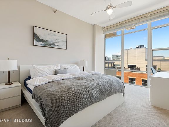 Extra large (1137 square foot) furnished corner one bedroom + den, one and a half bath with tons of windows and natural light! This home is a true entertainers layout- plenty of room for dining table for dinner parties and open concept kitchen with stainless steel appliances and ample counter space. Hardwood floors in the living areas. Spacious living room perfect for a sectional couch and entertainment center opens up to private balcony great for grilling and watching the West Loop sunsets. Large master bedroom with great closet space and ensuite full master bathroom. Half bath off foyer perfect for guests. In-unit washer dryer. Heated garage parking included. The building is situated in a perfect location to all the West Loop has to offer. Steps to Marianos, Whole Foods, Soho, Randolph Street, Fulton Market and the Mary Bartelme Park. Walking distance to Ogilvie, Union Station and the Loop. Full amenity building including door person, exercise room, common patio, dog run, bike room and party room. Ideally looking for 6 month furnished rental!