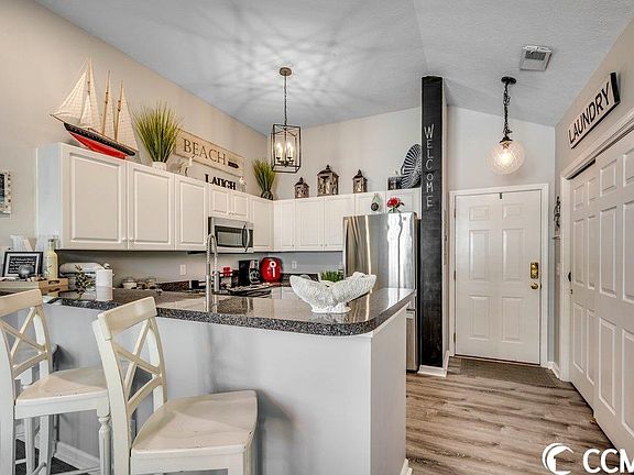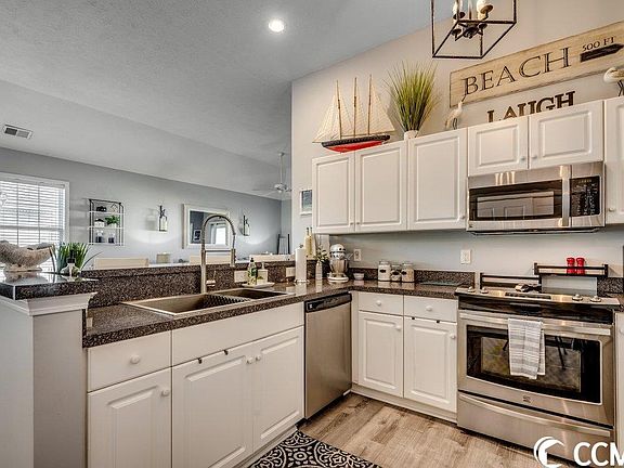 Beautifully updated 3 bedroom, 2 bath end unit condo in Carolina Keyes, a highly desired Intracoastal Waterway community. Sold fully furnished with tastefully updated furniture and artwork with a nautical & beachy décor. new HVAC was installed in 2022 and water heater was in 2016. The end unit provides additional windows for ample sunlight and the top floor provides for vaulted ceilings in the family and dining room. Luxury vinyl floors have been installed in the kitchen, bedrooms, dining area and family room. The kitchen features stainless steel refrigerator, dishwasher, stove & microwave over stove, white cabinets, double sink basin with upgraded faucet, breakfast bar and pantry. The huge 18’3x13’4 family room has a ceiling fan and a 3-panel glass slider door to the 13’x9’ screened porch (with ceiling fan). Condo sleeps 8 comfortably. The primary bedroom suite includes a stylish shiplap accent wall behind king-sized bed, tray ceiling, walk-in closet, and tub/shower combination in bathroom. Guest bedroom 1 has a queen bed and bunk bed while guest bedroom 2 has a queen bed. Ceiling fans with lights are in all bedrooms. Guest bathroom has a 5’ step-in shower. Condo has a stacked washer/dryer in closet across from kitchen, a smart thermostat, and a detached storage closet outside condo in hallway. Great amenities include 2 outdoor pools, hot tub/spa, kiddie pool, 2 pavilions, grill and picnic areas, and day docks. Owners are allowed pets and gas-powered golf carts (there is a waiting list). HOA fees include common maintenance and repair, water & sewer, basic cable and internet, building insurance (owner responsible for interior HO6 policy), lawn and pool maintenance, pest control (every 3 weeks interior), trash pickup, and property management. All this is located in the Ocean Drive section of North Myrtle Beach and is so close to shopping, restaurants, dance clubs, entertainment and of course the sandy shores of the Atlantic Ocean! Come see your new beach condo today!