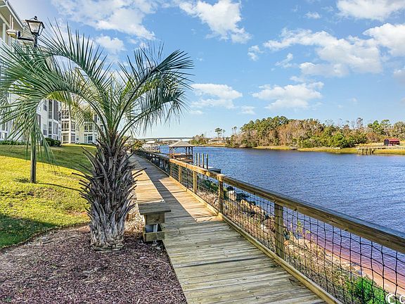 Bright & Cheery 2BR/2BA condo on the ICW. Sit and relax on your spacious deck overlooking the beautiful ICW or take a stroll along the boardwalk. Kitchen has plenty of light and much counter space. White cabinets, stainless sink, stove, refrigerator, and dishwasher. Foyer, kitchen, and both baths have ceramic tile floors; remainder of condo has new grey laminate flooring which had sound-proofing added under the flooring. A long breakfast bar separates kitchen from large dining area with beveled mirrors. Living room has a view of the water. Wood dining table w/ 6 chairs remains, along with a leather couch, flat screen TV and console, plus a coffee table, hutch, and electric fireplace. This is a split bedroom plan with the primary bedroom at the back of the condo, with a view of the water. Primary BR has a king size bed, 2 nightstands, chest, and armoire with TV. Also a walk-in closet. Attached bath has a vanity and tub/shower with vinyl surround. Second BR at front of the condo has a full size bed, hutch, and closet with mirrored doors. The entire unit has recently been painted a lovely light grey; ceiling fans in living room and both bedrooms; plantation blinds throughout to remain, and new water heater. Living room/dining area/kitchen have crown molding. There is a large storage closet in the hallway across from the stackable washer/dryer which is to convey. Outside storage room included. This is a golf cart friendly neighborhood plus there are garages on site. Also a community pool, kiddie pool, hot tub, and shaded picnic area are on the grounds.