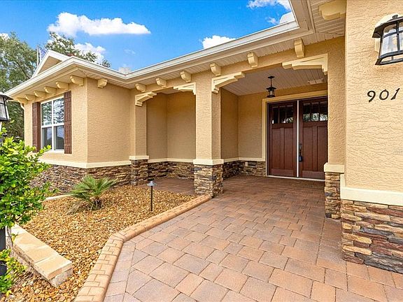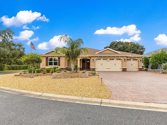 SELLER IS OFFERING $10,000 TOWARDS BUYER'S CLOSING COSTS OR A NEW GOLF CART WITH PURCHASE! This spacious Wellington model home is located in the much sought-after 55+ community of Candler Hills West in On Top of the World. It's in the Sanctuary section on an oversized corner lot. Featuring multiple stacked stone beds with mature plants and low upkeep. Outside lighting accentuates the beds and landscaping in the evening. You will really save on the water bill with this home! Extended paver drive and walkway. Double door entry into your 3 bedroom, 3 bath, 3 car garage home. The main living space includes engineered hardwood flooring, large granite island with porcelain iron sink. Stainless steel appliances, soft close cabinets, tiled backsplash and wall oven along will microwave & glass cooktop. (gas is available for the range) The home also includes tray ceiling, tinted sliders to the tiled screen room and solar shades on screen room. Beautiful paver back patio with a knee wall and an automated awning on those bright sunny days. A nice spot for entertaining and grilling. Inside there is also a formal dining room, large pantry, and living area with soaring ceilings. The main primary bedroom includes a large bathroom with double sink, granite counters, walk in shower with tiled surround and glass enclosure along with a walk in closet. The second primary also includes a granite top vanity, nice shower and walk in closet. There is a 3rd bedroom with a walk in closet and bathroom just outside of it with quartz counter and a tub/shower combo. We don't want to forget the flex space perfect for an office or hobby room. Inside laundry room with storage. The garage floors have epoxy to keep them clean and easy to maintain. There is a central vacuum system and so much more. Call for your appointment to view today!