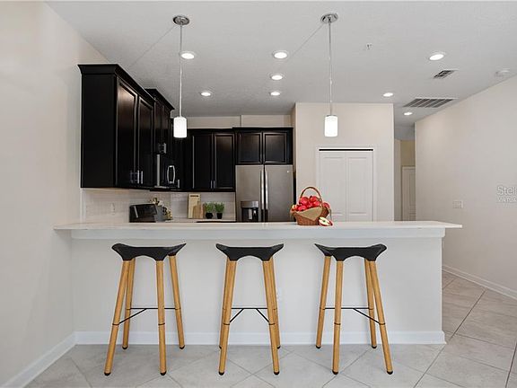 One or more photo(s) has been virtually staged. *EASY TO SHOW!* Modernized *MOVE-IN READY* 2BD/2BA *CORNER UNIT* CONDO with *NO REAR NEIGHBORS* in the *GUARD GATED* community of Champions Club Condos! As you enter the FOYER and follow the flow of this home, you will be at the heart of the home, the UPDATED KITCHEN! This gorgeous KITCHEN features RECESSED LIGHTS, GRANITE COUNTERS, 42" CABINETS, STAINLESS STEEL APPLIANCES, SUBWAY TILE BACKSPLASH and a large BREAKFAST BAR with additional seating for guests and UPDATED PENDANT LIGHT FIXTURES! A modern chandelier centers the space for the DINING TABLE which OPENS to the LIVING ROOM making this the perfect space to entertain friends and family. Neutral floors and wall tones along with the TRIPLE SLIDING DOORS allow tons of NATURAL LIGHT to consume the OPEN FLOOR PLAN making it bright and airy! The PRIMARY BEDROOM is generously sized and features a PRIVATE ACCESS door to the COVERED PATIO. The PRIMARY EN-SUITE includes a modernized DUAL SINK VANITY, UPDATED LIGHT FIXTURES, a TILE SURROUND GARDEN TUB and separate SHOWER STALL. Additionally you will find a spacious SECOND BEDROOM, a SECOND FULL BATHROOM as well as a LAUNDRY ROOM. The cozy SCREENED-IN BACK PATIO is perfect for relaxing after a long day and enjoying your favorite evening beverage! Steps away from The Country Club at Champions Gate, Champions Gate Country Club and just minutes to I-4, AdventHealth Celebration, Old Town, Disney Parks, ESPN Wide World of Sports Complex, Seaworld, Aquatica, Universal Studios, tons of local restaurants, shops and so much more! Conveniently located to all that Central Florida has to offer, this is the perfect place to call home!