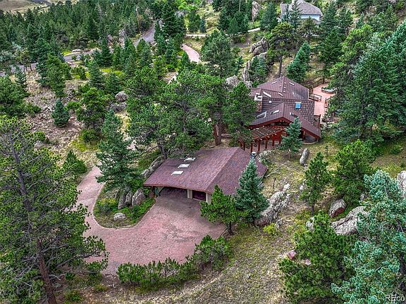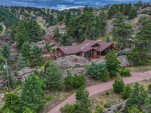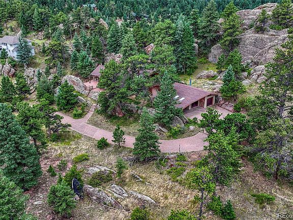 Stunning mountain home, close to the Denver Metro area! Located in the desirable Blue Mountain Estates, this custom home is set among trees and rocks and has beautiful views and abundant wildlife, making you feel like you're a world away on a mountain vacation! The outdoor living spaces are private and spacious, with a wrap-around deck, over 1,000 sq ft, that is built around the rocks and included hot tub. Gorgeous natural landscaping! Main living area boasts both a great room and a cozy family room, both with stunning stone, wood-burning fireplaces and wood beams. The kitchen, with Corian countertops and bar seating, is open to the dining room, which has access to the back deck. The main floor primary suite, with adjoining sitting room/office, elevator access, large private bathroom and access to an enclosed sunroom, has additional deck access. The main floor also has a bathroom and oversized entry foyer with views, which can be used as an office, library or sitting area. There is a spiral staircase down to the walkout basement with rec space with built-ins, bedroom with patio access, full bathroom, laundry and additional non-conforming bedroom. The upper floor of this home is a 2 level loft, where the possibilities for this space are endless, with extra storage, an addition half bathroom and extra storage. 2 car detached garage with workshop and cabinets, plus additional oversized carport. Newer high efficiency boiler and water heater. Short drives to Golden and Boulder, parks and recreation. Priced with your updates in mind...don't miss out on this amazing opportunity!
