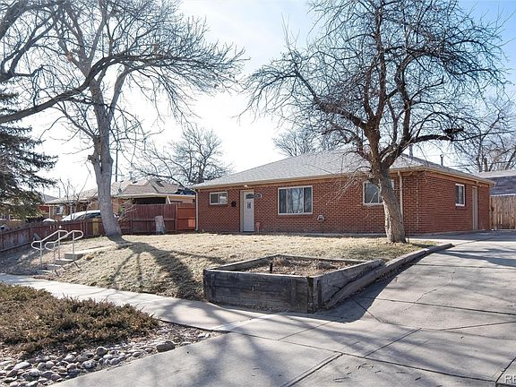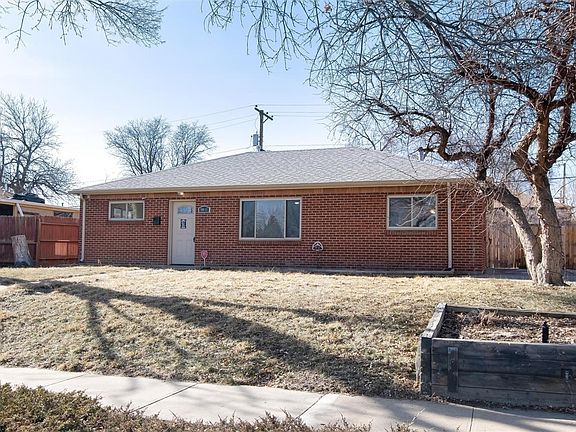 Brick Ranch house with 3 bedrooms and 2 bathrooms on a large fenced lot. New paint and carpet. Vinyl flooring in Living area, Eating Area, Kitchen and Laundry area. Newer stainless steel Appliances, Shaker style cabinets with soft close features and interior hinges. Granite counter tops. Updated Full bathroom and Updated 3/4 bath in the Primary Bedroom. Nice architectural doorways reflective of the time built, with a large window in the living area, ceiling fan for great air flow and another large window in the eating area for good natural light from the east facing front. Huge utility shed in the backyard, horseshoe pit, patio and very usable space to make a great back yard for an entertaining area on those beautiful Colorado summer nights. House sits up off the road with a large front yard. Laundry room area is a nice size and can also accommodate additional shelving for panty and kitchen storage. Awesome driveway that will fit several cars with direct side door access to the house that leads into the kitchen/laundry area. This was a totally renovated home in 2019 when Sellers purchased including a newer sewer line. Plenty of space to add a garage, either attached or detached.