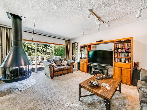 Private home surrounded by woods but still close to shopping & schools. Inviting slate entry w/wood paneling opens to the living area with a cozy & rustic hanging wood fireplace. Open & bright living areas throughout. Shaker style cabinets in the kitchen, spiral staircase to the upstairs which features an additional living area & office space. Sliding doors to the deck, perfect for entertaining or relaxing in your private yard. Spacious bedrooms & bathrooms, plenty of room for everyone!