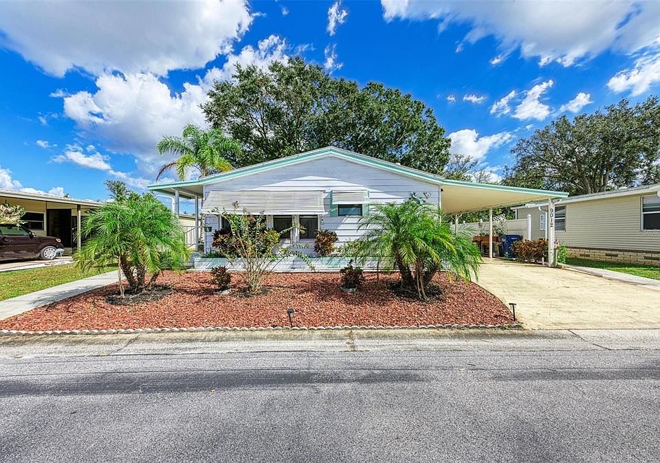 If you like the active lifestyle, come take a look at this friendly 55+ community offering resort-style living in Piney Point. This spacious double wide manufactured land owned home offers many great features for a relaxed lifestyle. Located in a pet-friendly section of the community, your eyes will enjoy your own private oasis of nature with mature trees and greenery behind the home. The 2 bedroom, 2 bath with a den/bonus room home has some great features including vaulted ceilings, an open floor plan with waterproof vinyl flooring in the kitchen, living area and den, large kitchen with stainless steel refrigerator and range, an abundance of kitchen counter space and cabinets with a granite composite sink, ceiling fans and outdoor storage/workshop/laundry room including washer and dryer with extra shelving. The added den/bonus room in the front of the home allows for a 3rd bedroom, an office or art and crafts. The master bedroom includes an en suite bathroom with a stand-alone shower. The year these items were installed are A/C unit (2021), roof (2015), water heater (2018), refrigerator (2021), washing machine (2021) Vinyl flooring (2021) and formica counters (2021). The HOA fee is only $180 per month and includes cable, internet, lawn maintenance, water, sewer, garbage and use of all amenities. The recreation hall is equipped with a kitchen, library, craft and billiards room. Adjacent to the recreation hall is a heated swimming pool and lighted shuffleboard courts overlooking the beautiful lake. Participate in fun social events including golf, bowling, bicycling, trips, potluck dinners, weekly coffee hour, dancing and many special events. This is a pet-friendly property allowing up to two pets. Rentals are permitted up to 3 times per year with a minimum 30-day rental period. Located only minutes away from shopping, I-75, tasty restaurants and entertainment.