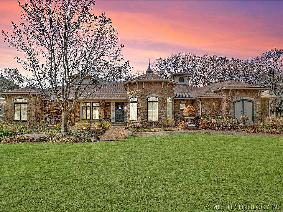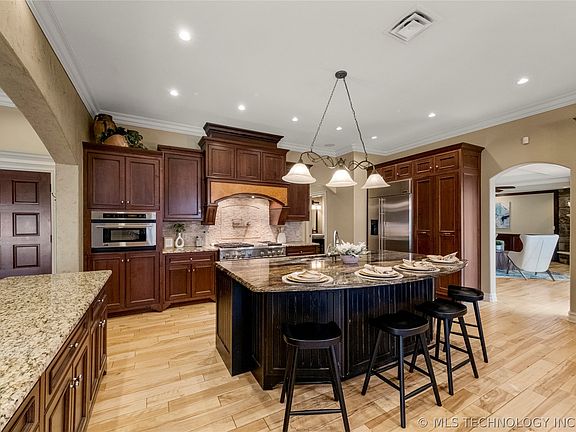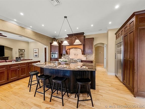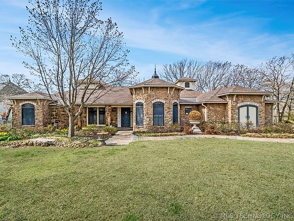 This lovely home, offering luxurious features and ample space for comfortable living and entertaining. Large foyer leads to various inviting spaces throughout the house. The heart of the home is the chef's kitchen, boasting a large gas cooktop with two ovens, a convection oven, microwave, pull-out pantry shelving, and a convenient butler's pantry. The informal dining area is perfect for casual meals, while the built-in China cabinet adds elegance to the space. Adjacent to the kitchen is the family room, featuring automatic blinds for added convenience. The formal living room impresses with a large stone gas fireplace. A separate bar room offers cabinetry, special lighting, and even a hidden door leading to the master bedroom, providing a unique touch to the layout. The expansive formal dining room showcases a custom-painted curved ceiling, creating a grand ambiance. Recessed lighting throughout the house adds to the overall charm and functionality. The master boasts a spacious layout with a curved ceiling, sitting area, and large his and hers walk-in closets. The master bath has two separate sinks, a jetted tub, a large steam shower, and original mural artwork on the bathtub wall. Accessible via a custom spiral staircase, the tower provides a tranquil space furnished with office furniture. Additionally, this property features a fully furnished, wheelchair accessible guest house, complete with a large bedroom, full kitchen, two bathrooms plus a large storage room. Outside, a stone walkway leads to the inviting pool area, featuring a free-form, in-ground, Gunite saltwater pool with a waterfall feature. For added convenience, there is a three-car garage with a workshop area, a separate storage building, and a large jungle gym for outdoor fun. Located in the prestigious Jenks school district and close to Tulsa Hills shopping, with easy access to Hwy. 75, this home offers the perfect blend of luxury, comfort, and convenience for discerning buyers.