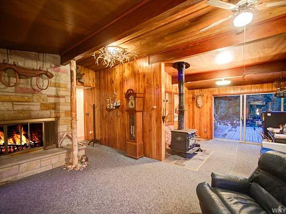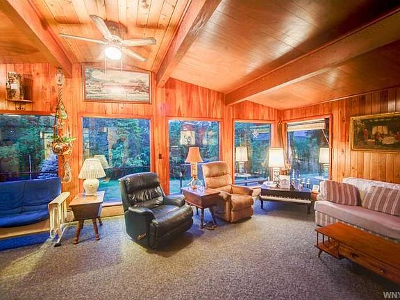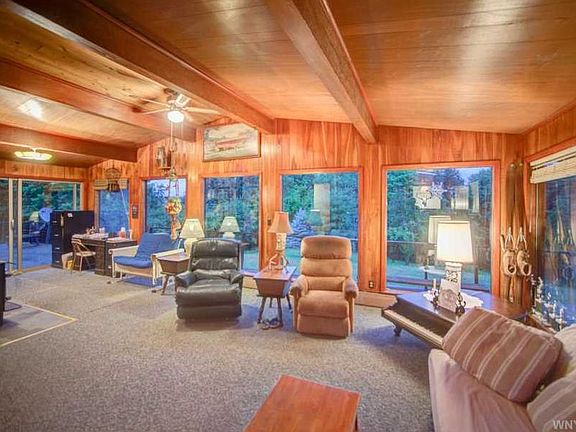 NEW PRICE! OFF THE ROAD AND PRIVATE! SPACIOUS BRICK HOME ON 8.6 MOSTLY WOODED ACRES. THIS HOME FEATURES SIMILAR CHARACTERISTICS OF A FRANK LLOYD WRIGHT PROPERTY. WITH THE NUMEROUS ROOMS ON THE WALK OUT LOWER LEVEL, IT COULD BE UTILIZED AS AN IN-LAW OR NANNY APARTMENT. THE LIVING ROOM AND THE FAMILY ROOM BOAST STONE FIREPLACES. THE ENCLOSED PORCH OFFERS A THIRD FIREPLACE. IDEAL FOR THE HOBBYIST. THE DETACHED GARAGE HAS ELECTRIC SERVICE. YOUR PERSONAL PARK, PLUS OVER 100 APPLE TREES, MAKE THIS THE IDEAL PLACE TO ENJOY NATURE'S BEAUTY. ONE YEAR HOME WARRANTY. NO DRIVEBYS. BY APPOINTMENT ONLY