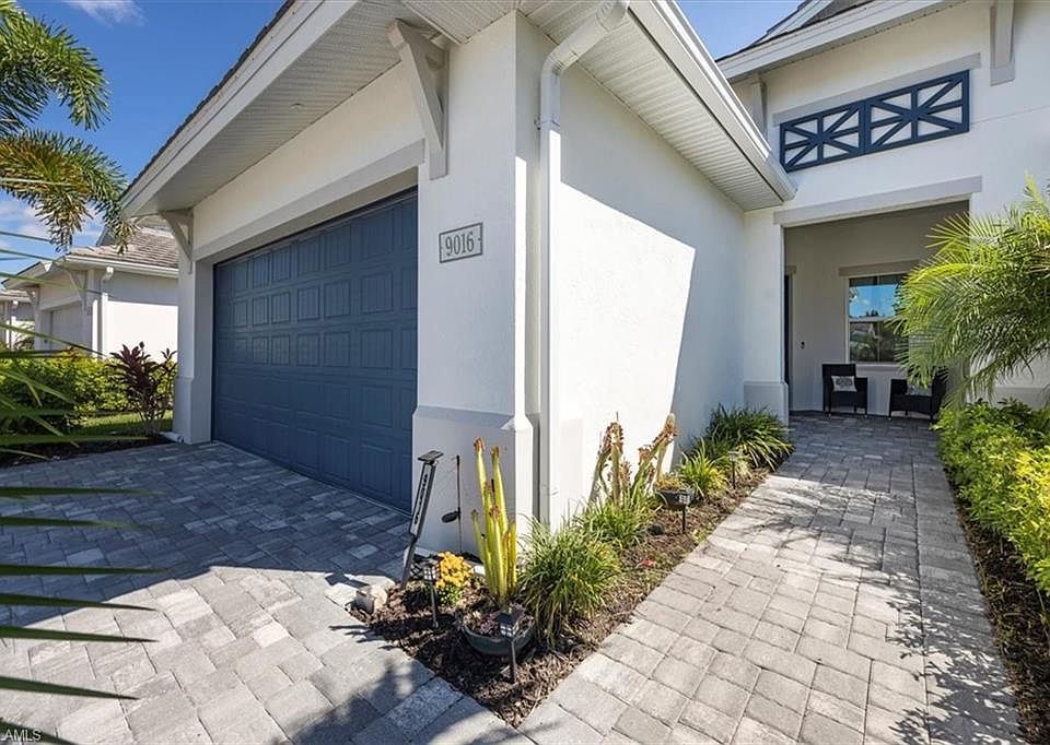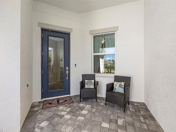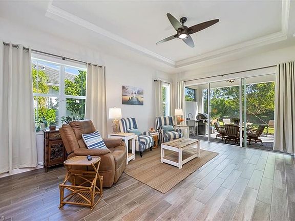 Welcome to 9016 Saint Lucia Drive in Azure at Hacienda Lakes—Naples, Florida, a premier gated community offering coastal-inspired living. This beautifully designed and furnished Baypointe Villa features 1,569 square feet of thoughtfully planned living space with 2 bedrooms, 2 bathrooms, a versatile den (ideal as a home office or optional third bedroom), and a spacious 2-car garage complete with built-in storage racks, cabinets, and a handy workbench for all your projects. Step inside and you’ll find 10-foot ceilings, wide wood-look tile flooring throughout, and elegant coffered ceilings in the foyer and great room. The open concept layout showcases a gourmet kitchen with gas cooking, stainless steel appliances, granite countertops, tile backsplash, breakfast bar and pantry. The kitchen flows seamlessly into the dining area and expansive great room—ideal for both everyday living and entertaining. The owner’s suite offers a bathroom featuring a dual-sink granite vanity, walk-in shower and spacious walk-in closet. The guest bedroom, located near a full bathroom, provides comfort and privacy for visitors. Additional upgrades include smart home technology, recessed lighting, ceiling fans, upgraded wood shelving in all closets, tankless water heater, hurricane impact front window and door, HVAC UV light for clean air, and a laundry room with tub sink. Outdoor living is equally impressive. Enjoy a private backyard with a covered lanai, extended brick pavers, open-air screen enclosure, outdoor sink and gas hookup for grilling. There’s also plenty of room to design your own dream pool. Residents enjoy resort-style amenities including a gated entrance, clubhouse with social activities and game rooms, billiards, café, library, heated pool and spa with cabanas, state-of-the-art fitness center, tennis and pickleball courts, firepit and a BBQ/picnic area. Located just minutes from downtown Naples’ 5th Avenue, Gulf Coast beaches, Marco Island, the Naples Botanical Garden, the Naples Zoo, top-rated shopping, exceptional dining and medical facilities, this home offers the perfect balance of convenience and luxury. Don’t miss the opportunity to make this villa yours. Schedule a private showing today and experience the vacation lifestyle at Azure at Hacienda Lakes.