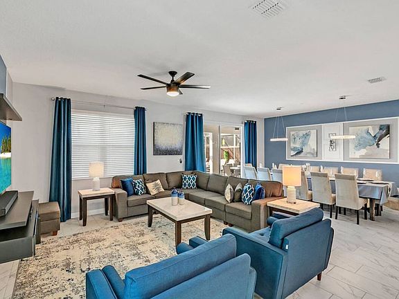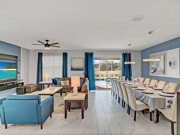 This spacious home is designed to impress with top-tier amenities and elegant touches, making it ideal for families or groups craving an unforgettable escape. Enjoy the ultimate blend of comfort and excitement, ensuring your stay is spectacular. The property features nine bedrooms and five bathrooms, including themed bedrooms, a private heated pool, and an arcade game room inside the house. The home highlights include a private heated pool, arcade game room, club house with arcade game room, pool patio furniture seating up to 10 people, smart TVs in all rooms, a business work desk, BBQ gas grill, dining area, super fast Wi-Fi, hot and cold A/C, washer and dryer, and complimentary toiletries, hair dryers, bed linens, and towels. The kitchen is fully stocked with modern appliances, including a fridge, stove, dishwasher, coffee maker, microwave, toaster, dishware, and silverware. Free parking is available for up to 7 cars. Additional reservation add-ons include private pool heating for $35 per day, a pet fee of $250 for the first pet and $50 for each additional pet, and rentals for pack 'n play, high chair, and stroller at $25 each. Located in a gated community with 24-hour security guard, the property offers access to water parks, a resort pool, lazy river, hot tub, kid's splash pad, water slides, fitness center, half basketball court, sand volleyball court, tiki bar, ice cream shop, kayaking, mini-golf, movie theater with 4k viewing, tennis court, and adult golf course. Nearby attractions include Animal Kingdom, Magic Kingdom, Epcot, and Hollywood Studios, all approximately 17 minutes away, and Universal Studios, Volcano Bay, and SeaWorld, about 27 minutes away. The maximum limit for cars at the property is 7. Guests should not create excessive noise that disturbs neighbors, with code-enforced neighborhood quiet hours from 10pm to 8am. Smoking is prohibited inside the property, and a fine of up to $500 may be imposed if the house smells like smoke. To avoid any additional charges, please leave the home in the same condition as when you arrived.