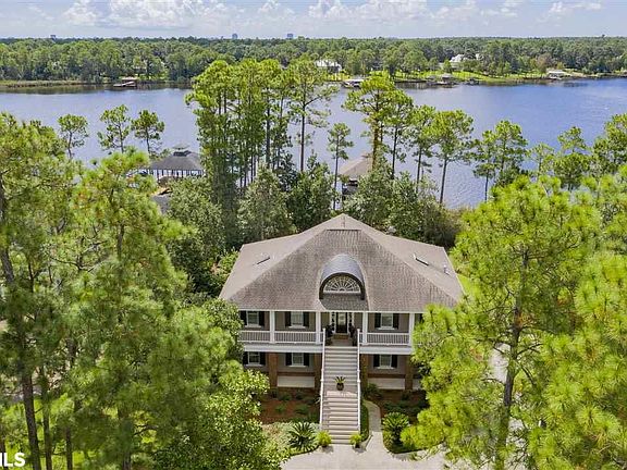 Impressive and exquisite custom built Louisiana Creole style home that has magnificent views of Wolf Bay. Circular drive leads to a sweeping staircase onto the 56x6 front porch. Enter the foyer through beautiful wood/beveled glass door. Den and half bath off of foyer. Great room offers vaulted ceiling and fireplace flanked by wood bookcases/shelves Living Room is adjacent to the 26x14 screened porch which is perfect for enjoying breathtaking sunsets. Formal dining room is adjacent to a cook's dream kitchen that boasts custom wood cabinets, granite countertops, stainless steel double sink, double oven, wet bar and breakfast bar. Private master suite has 14x7 deck overlooking the bay. Master bath has double vanity, separate shower and jetted tub plus 19x8 walk in closet. Lower level is a perfect and private area for guests--2 bedrooms and 2 bathrooms are adjacent to spacious rec room. Two storage/workshop rooms are 25x15 and 14x11. 2 car attached garage. HOME IS EQUIPPED WITH AN OUTDOOR 4 FT SQUARE WATER POWERED LIFE/ELEVATOR. Storm shutters. Boat house has 2 electric boat lifts. Lot is 111 feet on the street, 120 feet on the water, and 317 feet deep.( Den is used as an office and has a closet. Other room is screened back porch) Home is located within the City Limits of Foley and has a mailing address of Elberta. Elberta schools. There is so much to this home so please refer to a feature sheet in documents for a list of exceptional amenities.... PERFECT HOME AND SETTING FOR ENTERTAINING!!