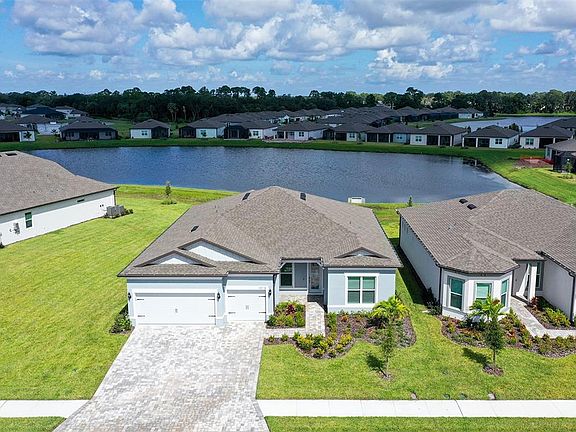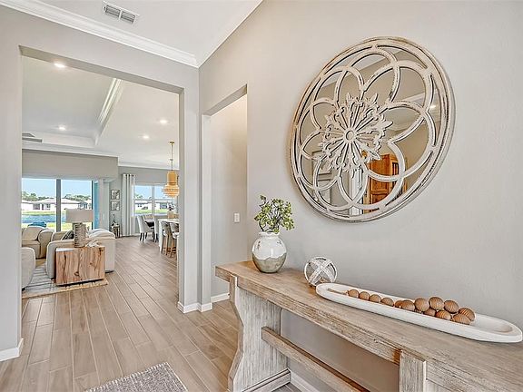 Welcome to this exquisite waterfront Stellar floor plan, perfectly positioned on an oversized cul-de-sac lot within the highly sought-after, guard-gated Del Webb Bayview community. Built with peace of mind in mind, the home features impact-rated glass windows and doors throughout—no hurricane shutters needed. Inside, you will find 3 bedrooms, 3 full bathrooms, a large den/office, tray ceilings, crown molding, luxury plank flooring, and motorized ceiling fans. The gourmet kitchen is a showpiece with veined quartz countertops, a custom built-in pantry, upgraded KitchenAid appliances, pull-out shelving, soft-close drawers, and an oversized island that seamlessly flows into the warm and inviting living area. A spacious dining area sits just off the kitchen and includes custom window treatments, plantation shutters, and high-end lighting. The owner’s suite is a true retreat, offering large windows and an oversized walk-in shower with floor-to-ceiling tile, a large niche, convenient bench seat, dual shower heads, and a rain shower feature. The owner’s closet is generously sized and professionally designed for optimal organization. The second bedroom provides an ideal guest sanctuary with its own private, spa-like bathroom—beautifully finished with custom floor-to-ceiling tile and seamless glass doors. The well-appointed laundry room makes everyday tasks a breeze with built-in cabinetry and a utility sink. Zero-corner sliders open the living space to the expansive lanai, which is pre-plumbed for an outdoor kitchen and equipped with a remote-controlled wind/solar screen. The serene water view and large lot present the perfect setting for a future pool. Residents of Del Webb’s premier 55+ community enjoy exceptional amenities including a clubhouse with fitness center, zero-entry pool, resistance pool, spa, and onsite restaurant, along with a vibrant calendar of activities, clubs, and outdoor recreation. Ideally located near St. Pete, Tampa, and Sarasota, you’ll have effortless access to dining, shopping, entertainment, and world-renowned beaches. Why wait for new construction? This move-in-ready home has it all. Disclaimer: Please note that the furniture shown in the online photos is no longer in the home. The homeowner lived on the property for only five months and moved, taking her furniture with her. The home has since been professionally staged with different furnishings than those depicted in the photos.