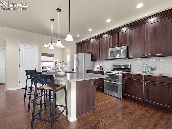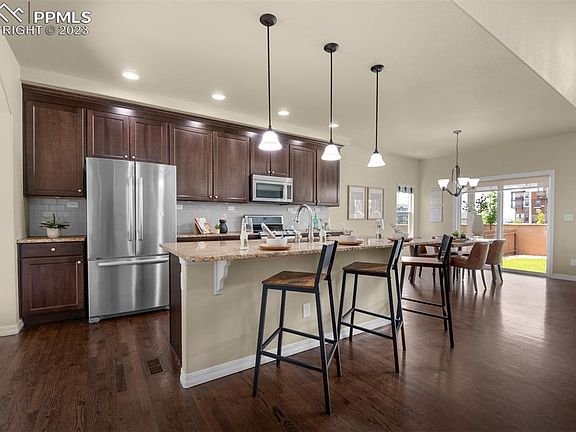 Your new home awaits at this lovely Cordera two-story home with its original owners! Natural light and space abound throughout the well-maintained interior and are accented by gorgeous hardwood floors. Enjoy a sweeping open concept main floor accented by a soaring two-floor vaulted ceiling and a cozy gas fireplace flanked by a handsome mantle, tile surround, and built-ins. The well-appointed kitchen delights with beautiful granite countertops, an island with seating, a classic subway tile backsplash, Shaker-style cabinetry, a pantry, and a stainless steel appliances including a gas range with double ovens. Designed with entertaining in mind, there are two dining spaces; one elegant formal space and one informal space that connects to the covered patio for a seamless transition to outdoor soirees. The main floor is completed by access to the three-car garage, a full bathroom, and a dedicated office. Retreat to the upper level primary suite that impresses with a large bedroom, a walk-in closet, and additional closet, and a luxurious five-piece bathroom. The upper level is completed by a convenient laundry room, three sunny secondary bedrooms, and a full bathroom with double sinks. More living space awaits in the finished basement that hosts a generous rec room, a conforming bedroom, and a full bathroom. Also of note are the reverse-osmosis water filtration system under the kitchen sink and the wet bar rough-in in the basement. There is also great outdoor living space offered by the xeriscaped front yard and the spacious fenced backyard that has a dog run and raised garden beds. Wonderful location blocks away from multiple parks, miles of trails, and the fantastic community pool and clubhouse in a beautifully maintained neighborhood within the highly-rated Academy 20 School District.