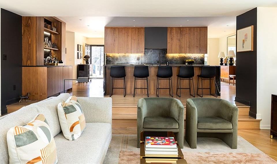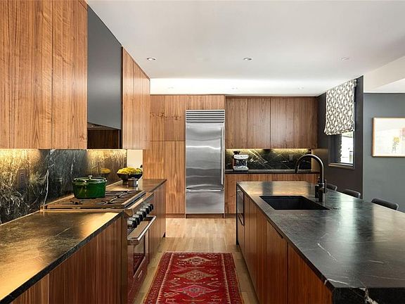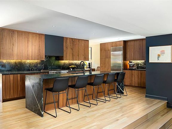 Soapstone waterfall countertopStone patioNatural and ambient lightingAbundant natural lightPrivate yardCustom walnut cabinetryFrameless glass