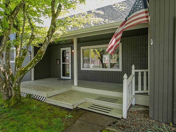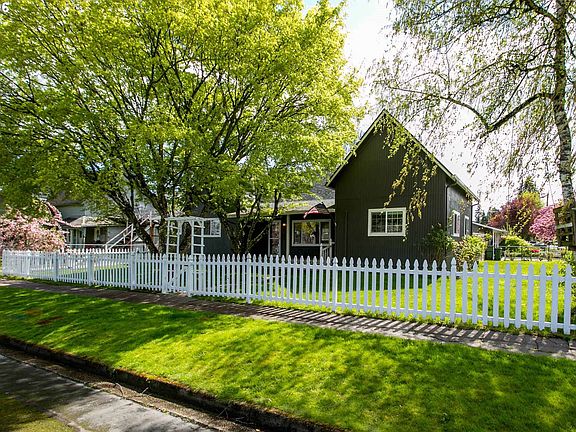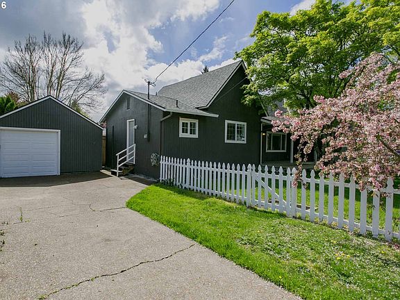 Charming one level on corner lot in the heart of Newberg! Updated kitchen with fresh paint, built in microwave, Oak wood cabinets new molding and an eating nook with a slider to the back yard. New dark flooring and paint in the living room. Large master with fresh paint and a ductless A/C. Covered front porch, white picket fence, new front door, detached 1 car garage, all new exterior paint!