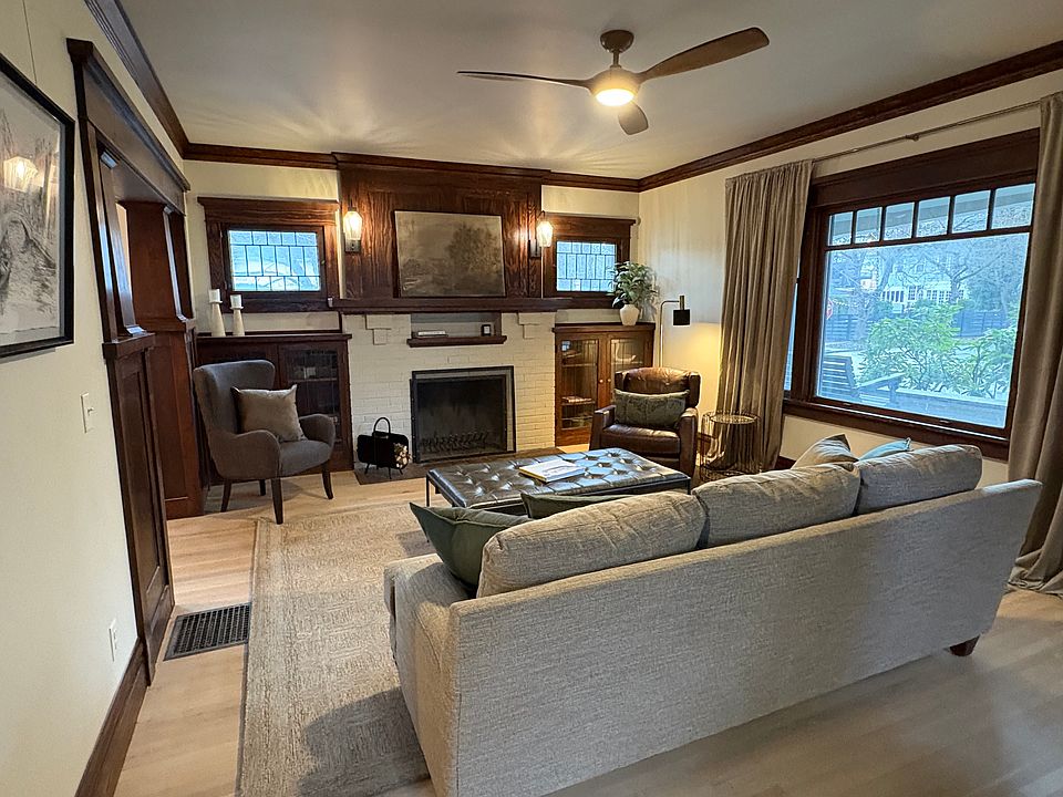 This 1904 home has been fully renovated. With all the original built-ins and hardwood floors, the charm and designer-selected finishes of this historic home make it unique. Located just one block from the quaint downtown of Coeur d'Alene with its library, McEuen Park, Tubbs Hill beach area, coffee shops, restaurants and shopping. 5 bedrooms and 3.5 bath home on tree lined quiet street in historic Garden District. Home has in kitchen dining as well as formal dining room, living room with wood burning fireplace, formal living, office, and media/recreation room. Parking on site and fenced front yard. New carpet, paint, kitchen cabinets and countertops, new appliances, landscaping and renovated plumbing and electrical. Renters responsible for water and utilities. This is a non smoking property and home. Renters will need to water the lawn and keep up the landscaping. Lease term 1 yr with renewal possible at the end of the term. There is street and off-street parking available. Tours available after May 10, 2025.
