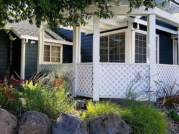 Comfortable home with wrap around patio/deck in front yard, corner lot. Solar. Interior has vaulted ceilings, wood flooring, lots of windows. Quiet neighborhood. Attached garage entrance on side of house. Landscaped yard.
