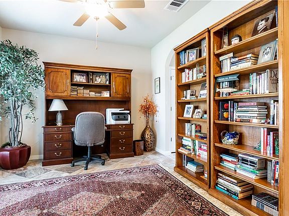 Stunning single-story home! One of a kind custom ceramic tile in kitchen, living room, both bathrooms, study/dining room and on covered patios. Oversized granite countertop in kitchen w/built in seating and fans throughout. Gutters around entire house to protect the foundation. Only 10% of the homes have this feature. There is also a programmable sprinkler system, fireplace and a security alarm system. This is an ENERGY CERTIFIED home. A cut above the rest, this home won't last long.